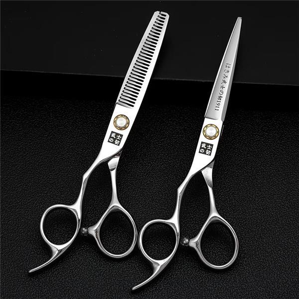 Balkezes ritkító és hajvágó olló szett Japán acélból. A hajvágó fodrász ollók, sima borotva éles vágó éllel rendelkeznek. Ergonómikus kialakítású fodrászkellék. A hajvágó ollót, edzett acélból készítették, éle alkalmassá teszi fodrász munkaeszközként minden típusú hajvágás elvégzésére. A hajvágó ollókat állítható csavaros szorítóval rendszerrel szerelik. A csavar teljes kicsavarásával az olló pengék szétválaszthatóak, ezért szükség esetén azok újra élezhetők.